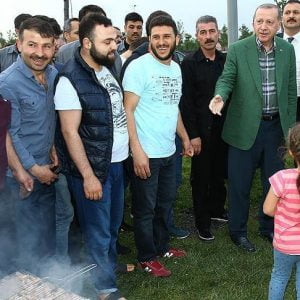 تجاذب الرئيس، رجب طيب أردوغان، أطراف الحديث مع مجموعة من المواطنين، كانوا يستعدون للإفطار في إحدى حدائق إسطنبول، اليوم السبت.