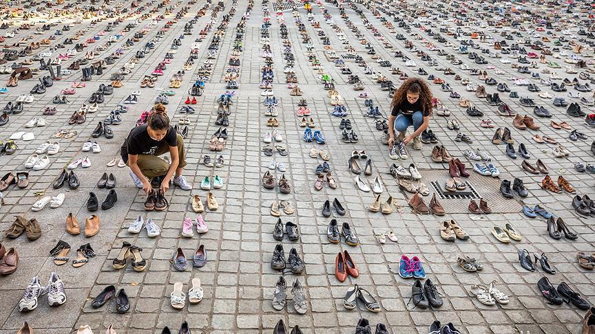 وجاءت الحركة اللافتة أثناء انعقاد اجتماع وزراء خارجية الاتحاد، حيث وضع النشطاء 4 آلاف و500 زوج من الأحذية أرسلها متبرعون من مختلف أنحاء أوروبا، أمام مبنى المجلس، في ميدان “جان راي”، بالعاصمة البلجيكية بروكسل.