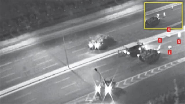 حيث ظهر في إحدى التسجيلات التي تم سحبها من كاميرات المراقبة التي كانت حول مبنى القيادة العامة لقوات الدرك التركية بأنقرة؛ لحظة سقوط 4 مواطنين أتراك شهداء أمام دبابات الانقلابيين.