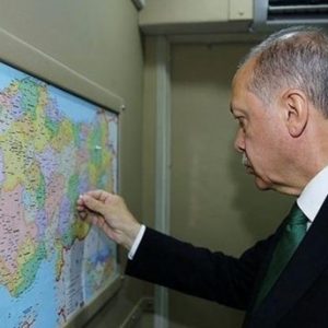 وأظهرت صور متعددة أردوغان وهو يضع إشارة على المحافظات التي يزورها ضمن استراتيجيته للتواصل مع الشعب التركي في جميع المحافظات.