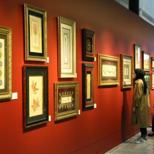 ويحتوي المعرض على آثار فنية في مجالات مختلفة، منها فن الخط وفن التذهيب وفن الرسم على المياه الذي يعرف بـ “الإيبرو”.
