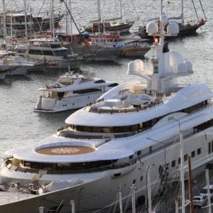 رسا يخت “Pelorus” المملوك لأحد أفراد “آل نهيان” بالإمارات، في ميناء منطقة “فتحية” بولاية موغلا السياحية، غربي تركيا.