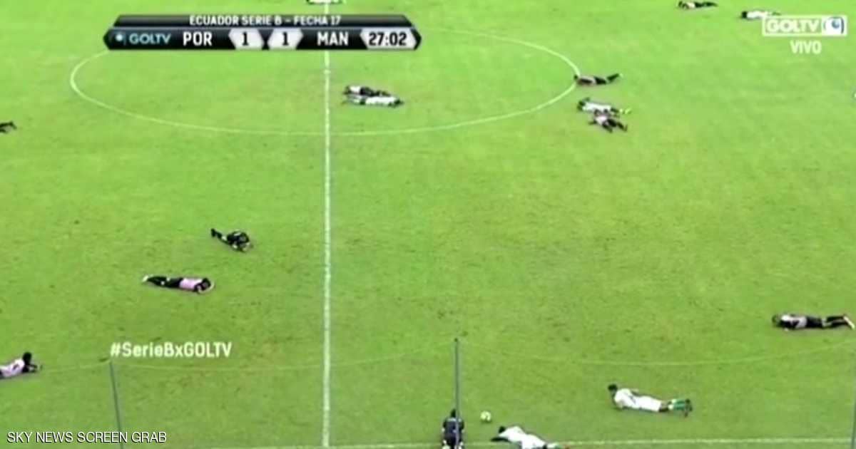 وأظهر تسجيل مصور اللاعبين كافة والجهاز الفني للفريقين والحكام وهم يستلقون على أرضية الملعب، الذي شهد مباراة بين فريقين من الدرجة الثانية في الدوري الإكوادوري، السبت الماضي.