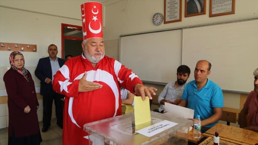 وفي ولاية “قهرمان مرعش” جنوبي البلاد، جاء المواطن محمد آغ غوربوز إلى المركز الانتخابي مرتديا ملابسا رسم عليها العلم التركي.