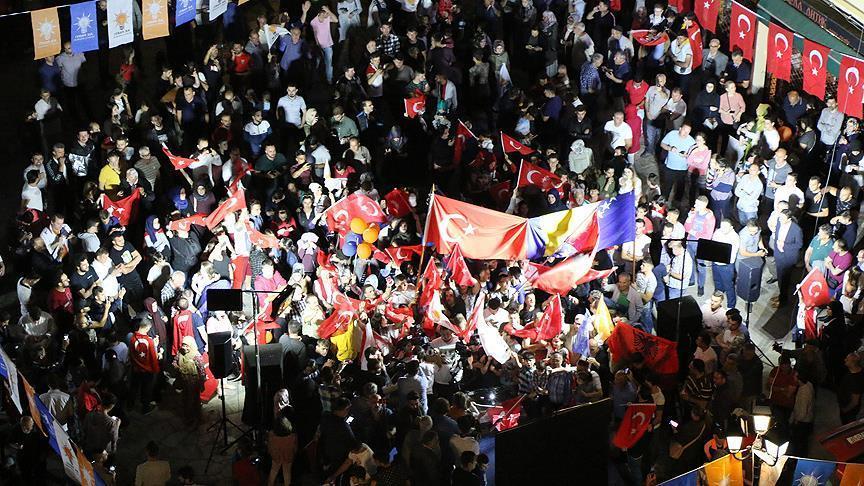 ورفع المحتفلون صورًا لأروغان، ورايات حزبي العدالة والتنمية، والحركة القومية اللذين يشكلان تحالف الشعب، وهم يتجولون بسياراتهم في الشوارع وسط ترديد هتافات مؤيدة لبلدهم.