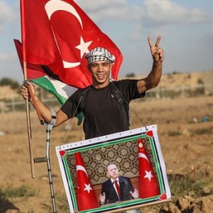رفع شبان فلسطينيون، في قطاع غزة، الجمعة، صورة الرئيس التركي رجب طيب أردوغان، وعلم بلاده، على مقربة من السياج الفاصل بين قطاع غزة وإسرائيل، شرقي مدينة غزة خلال مسيرات “العودة”.