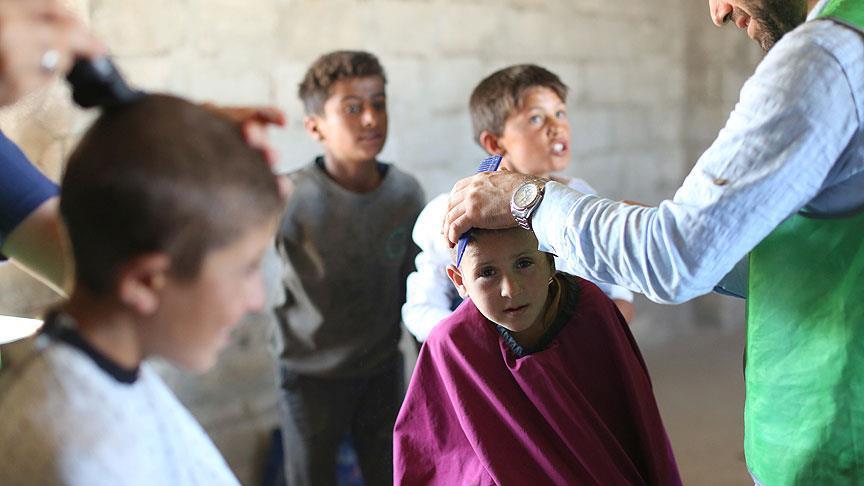 وأفاد فرهات دوبو أوغلو، أحد الحلاقين المتطوعين، للأناضول، أنه وزملائه قدموا من تركيا لتقديم حلاقة مجانية لأطفال المخيمات.