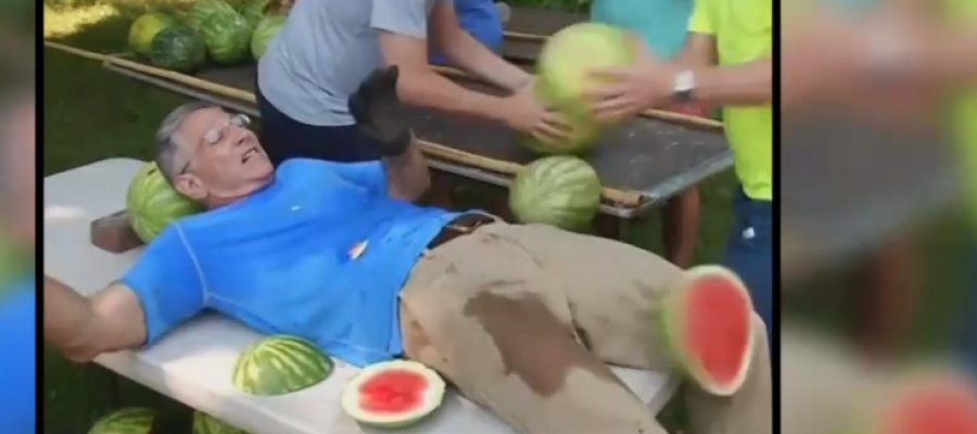 ويظهر فورمان ممدداً، بينما يضع آخرون البطيخ على بطنه. وكان فورمان قد سجل في السابق رقماً قياسياً لتقطيع البطيخ فوق بطن شخص آخر، لكنه قرر هذه المرة تحمُّل كل المخاطر على عاتقه، حسب موقع abcnews.