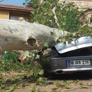 أدى سقوط شجرة ضخمة في مدينة عثمان غازي التابعة لولاية بورصة غربي تركيا، إلى تحول سيارة فارهة إلى قطعة من الخردة.