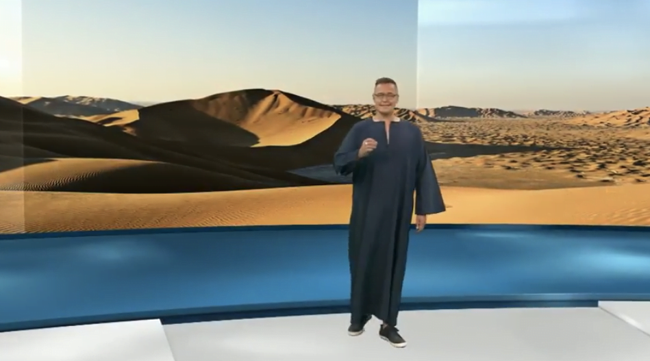 تداول رواد مواقع التواصل الاجتماعي، مقطع فيديو يظهر مذيعا ألمانيا وهو يرتدي “جلابية” خلال إذاعته النشرة الجوية.