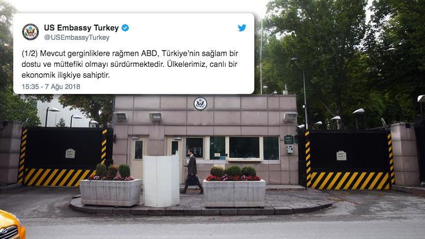 قالت السفارة الأمريكية لدى أنقرة إنه رغم التوترات الحالية (بين أنقرة ووشنطن) فأن الولايات المتحدة ما تزال صديقة قوية وحليفة لتركيا.