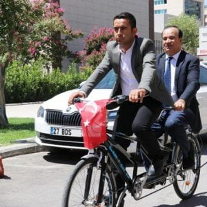 يذهب رئيس دائرة المعاقين التابع لبلدية غازي عنتاب جنوب تركيا يوسف جلبي، إلي عمله باستخدام الدراجة الهوائية بدلا من السيارة الرسمية التي منحته إياها رئاسة البلدية.