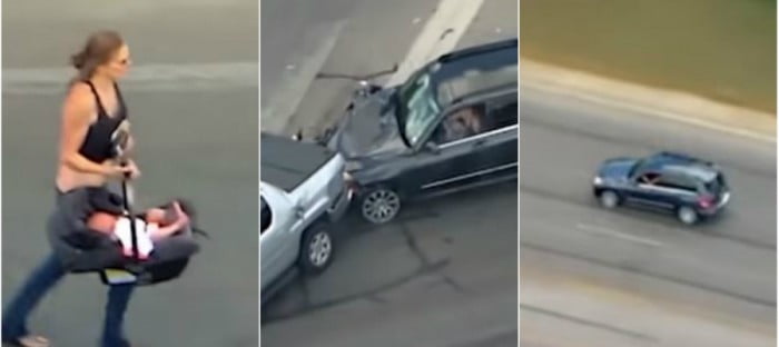 وتقول السلطات إن المرأة كانت تهرب من مذكرة توقيف بحقها، وهي متهمة بتعريض الأطفال للخطر وحيازة مادة خاضعة للرقابة. واصطدمت المرأة بسيارة أخرى في التقطاع قبل أن تخرج وتأخذ طفلها وتجري تائهة في الطريق.