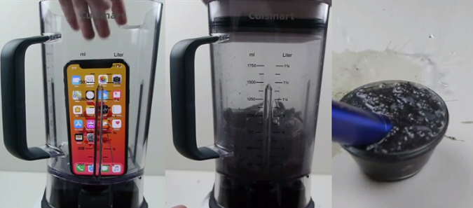 ظهر صاحب الفيديو يضع الهاتف الذي يبلغ قيمته 999 جنيها إسترلينيا في الخلاط، حيث تحول إلى شظايا صغيرة، ثم أضاف إليه الماء ليحوله إلى عصير.