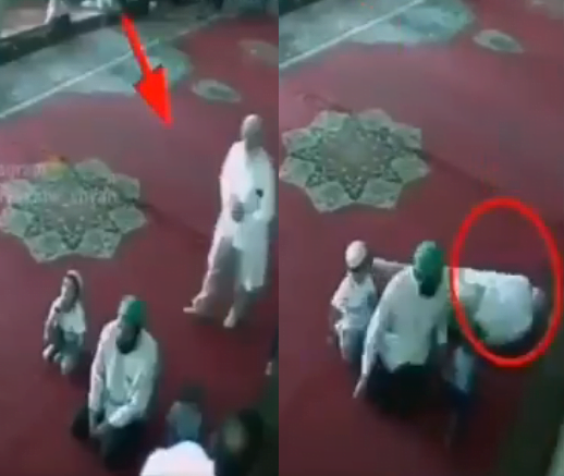 ويظهر الرجل وهو يمنح طفلين يتواجدان بصحبة والدهما في المسجد، ما يُعتقد أنّها أموالاً، وبعد انتهائه من ذلك، سقط أرضا فتجمع حوله المصلون ليجدوه قد فارق الحياة.
