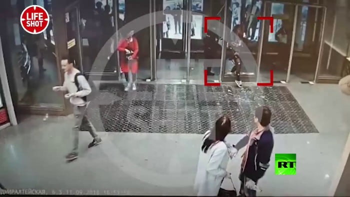 تداولت مواقع الإنترنت في روسيا فيديو من كاميرات المراقبة بإحدى محطات المترو في مدينة سان بطرسبورغ الروسية يظهر فتاة تدخل المحطة ولم تلاحظ الباب مغلقا أمامها فدخلت في الزجاج.