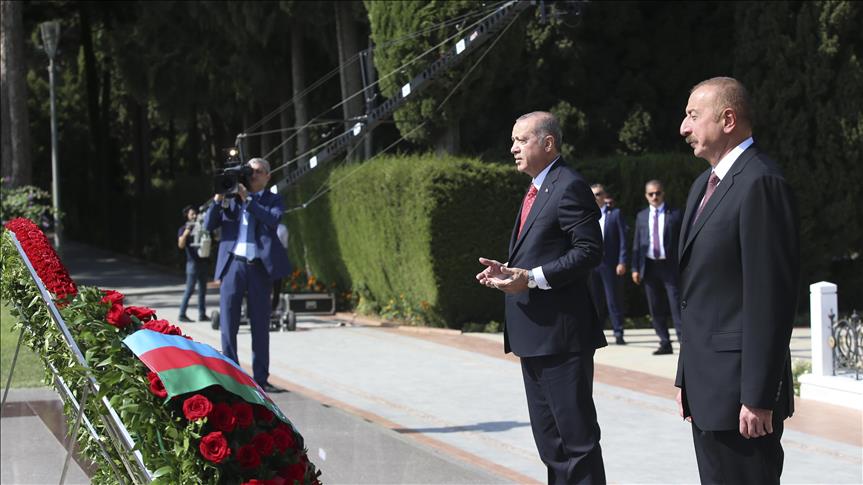 وعقب ذلك، توجه أردوغان مع علييف إلى الضريح، ثم إلى مقبرتي الشهداء الأذريين والأتراك، ووضع أكاليل زهور على الضريح والمقبرتين.