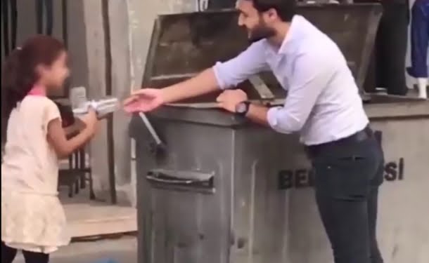 وبعد فترة يأتي الشاب التركي ليقدم النقود للطفلة، ومن ثم يمد يده إلى الحاوية ليأخذ الزجاجة ويقدمها للطفلة، في مشهد إنساني نال تقدير وإعجاب مشاهدي المقطع المصور.