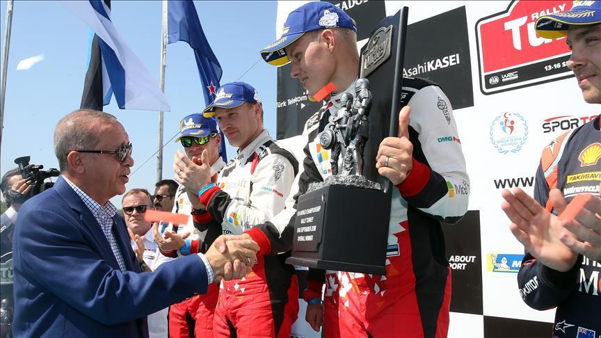 قدم الرئيس التركي، رجب طيب أردوغان، الكأس للسائق الأستوني “أوت تاناك”، الذي أحرز لقب بطولة المرحلة العاشرة من منافسات بطولة “رالي تركيا” الدولي المقامة في ولاية “موغلا” التركية.