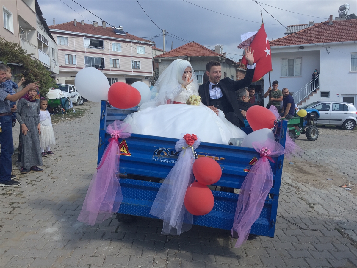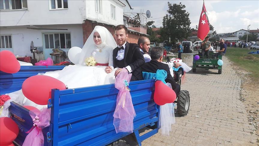 اختار زوجان تركيان في ولاية مانيسا (غرب) استخدام جرار زراعي كسيارة زفاف، بدلا من سيارة فاخرة.