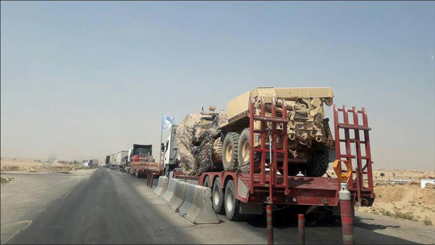 وتمكنت كاميرا الأناضول من رصد الشاحنات الأمريكية وهي محملة بالعربات المصفحة وناقلات الجنود وذخائر لأسلحة وبنادق خفيفة ومعدات أسلحة ثقيلة، وآليات حفر، وبيوت مسبقة الصنع.