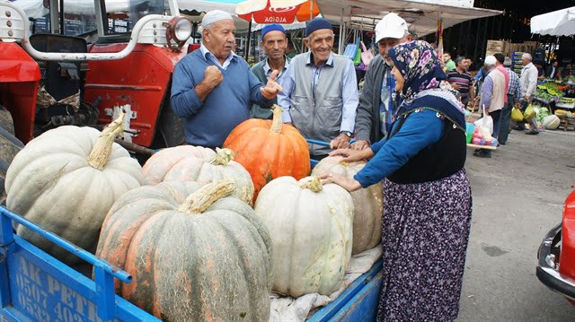 عرض مزارع تركي في سوق للمنتجات الزراعية، بولاية صامسون شمالي البلاد، ثمرة قرع تزن 57 كيلوغرامًا.
