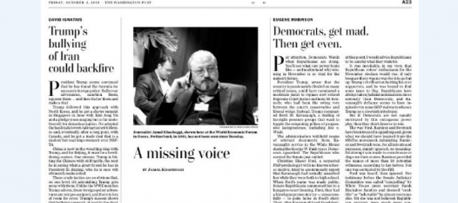 بعد أن نشرت مقالاً تضامنياً مع الصحافي السعودي جمال خاشقجي المختفي منذ دخوله قنصلية بلاده  ظهر الثلاثاء 2 أكتوبر/تشرين الأول 2018، عرضت صحيفة واشنطن بوست مساحة فارغة للعمود الذي كان يكتب فيه جمال خاشقجي وكتبت بجوار صورته «صوت مفقود».