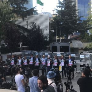 وشارك في الوقفة التضامنية التي نظمتها “جمعية بيت الإعلاميين العرب”، إعلاميون عرب وأتراك، وناشطين في مجال حقوق الإنسان، إضافة إلى الناشطة اليمنية، توكل كرمان الحائزة على جائزة نوبل للسلام.