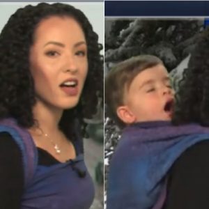 ظهرت مذيعة على إحدى وسائل الإعلام الأميركية وهي تحمل رضيعها فوق ظهرها، بينما كانت تقرأ نشرة أحوال الطقس، وحظيت فيديوهات متداولة لها بملايين المشاهدات والإعجابات.