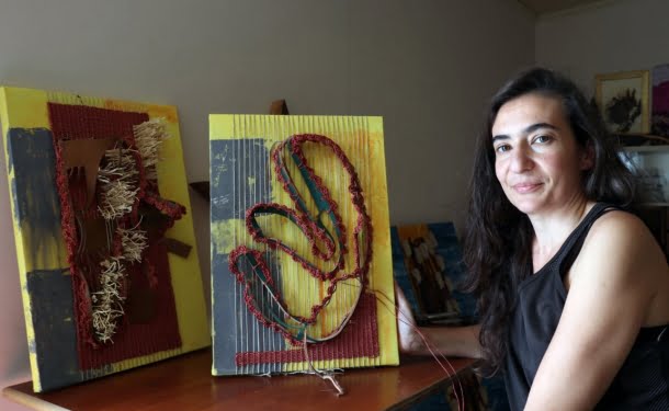 وحولت أركان الطابق العلوي من منزلها إلى ورشة عمل، تتفنن فيها في صنع لوحات باستخدام أغمدة السكاكين والأسلحة القديمة والمهترئة التي تجمعها من محلات الجلديات.