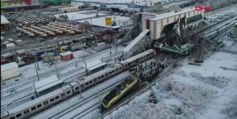 وثقت طائرة بلا طيار مشاهد من حادث اصطدام قطارين في أنقرة، اليوم الخميس، أسفر عن 7 قتلى وعشرات الجرحى.
