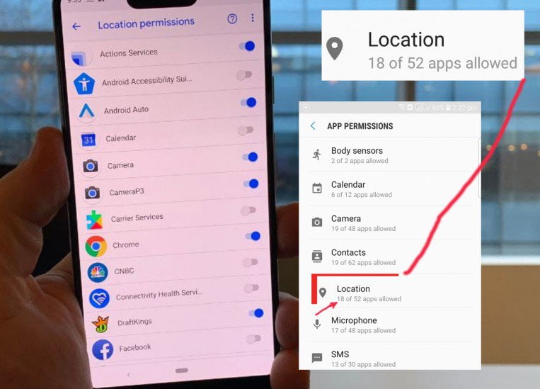 وفي هاتف أندرويد يمكنك في الإعدادات البحث عن صلاحيات التطبيقات App permissions، واختيار خدمة المواقع.
