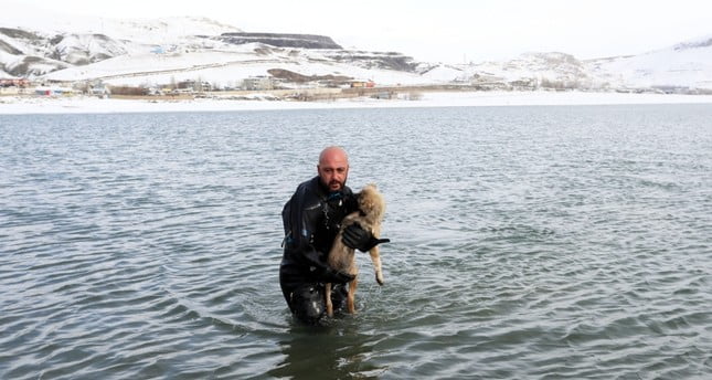 قام شرطي تركي بولاية وان جنوب شرقي تركيا بإنقاذ جرو كان على وشك الموت متجمداً بعد ان انكسر الجليد ببحيرة سهكه بالولاية.