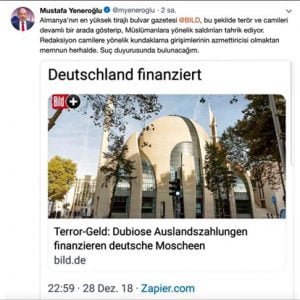 جاء ذلك في إطار ردود الفعل على تقرير نشرته الصحيفة المذكورة بعنوان “كيف يموّل الإرهاب مساجد ألمانيا”، مرفقًا بصورة لمسجد تابع للاتحاد الإسلامي التركي للشؤون الدينية (ديتيب).