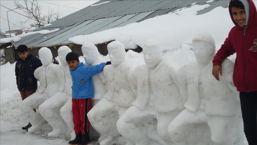 النحات حاجي فند أوغلو، جمع الثلوج التي تساقطت على حديقة منزله على مدى أسبوع، ليقوم بتحويل الكتلة الثلجية إلى فريق فولكلوري مؤلف من 8 أشخاص.