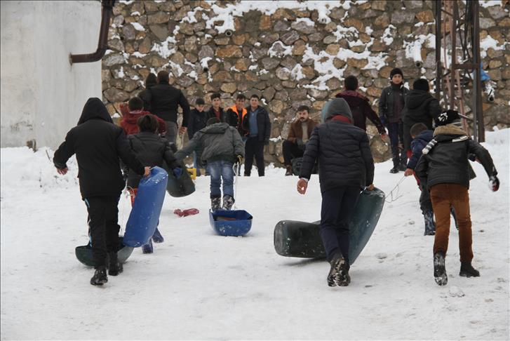 واستغل أطفال القضاء العطلة الدراسية التي منحت لهم بسبب الثلوج الكثيفة التي تساقطت على المنطقة، ليصنعوا زلاجاتهم الخاصة من أوعية بلاستيكية، ويتزلجوا لمئات الأمتار فوق بساط أبيض من الثلج، بحسب مراسل الأناضول.
