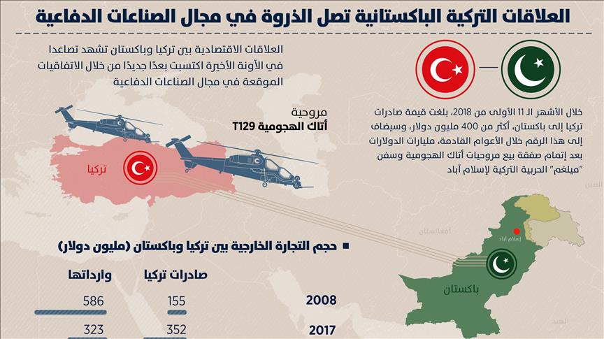وخلال الأشهر الـ 11 الأولى من العام الماضي، بلغت صادرات تركيا إلى باكستان أكثر من 400 مليون دولار، وسيضاف إلى هذا الرقم خلال الأشهر القادمة مليار دولار، بعد إتمام صفقة بيع مروحيات أتاك الهجومية ومنتجات مشروع “ميلغم” لترسانة الجيش التركي.
