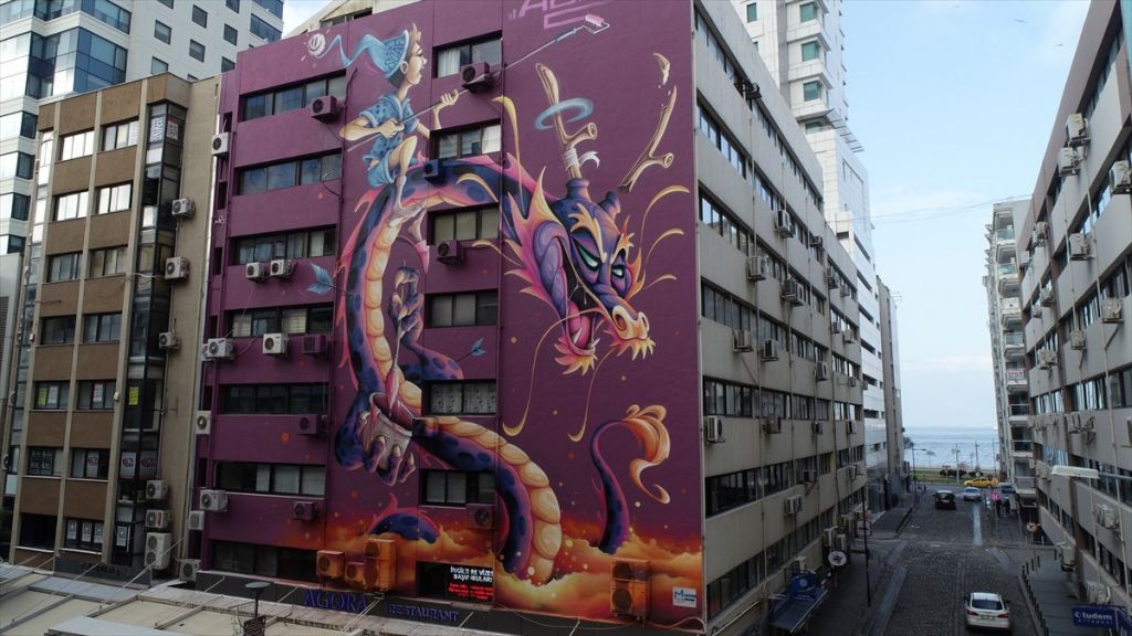 ضمن فعاليات ثقافية وفنية أقامتها بلدية ولاية إزمير غربي تركيا، بمناسبة مرور 150 عامًا على تأسيسها، تلونت جدران بعض الأبنية في المدينة بلوحات متنوعة لفناني رسم على الجدران.