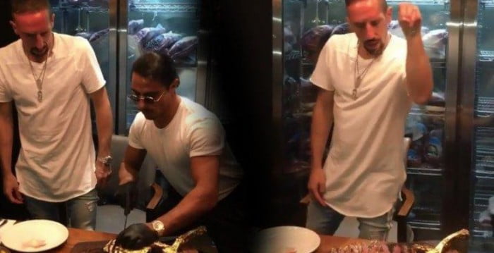 وكانت القصة قد بدأت في مطلع شهر يناير/كانون الثاني الجاري، عندما ظهر فرانك ريبيري واقفاً إلى جانب الطاهي التركي الشهير نصرت غوكشيه، في إمارة دبي، مستعداً لتناول قطعة لحم «مذهبة».