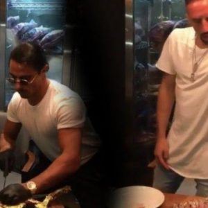 ونشر الطاهي المعروف برشّه الملح بطريقة مميزة فيديو للنجم الفرنسي وهو يشاهد تقطيع شرائح اللحم المطلية بالذهب، قبل أن يقوم برش الملح عليها بنفسه.
