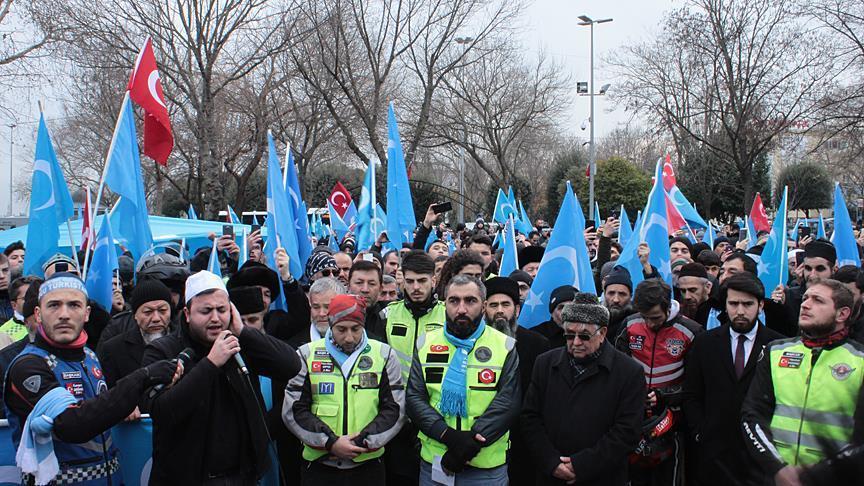 ورفع المشاركون علمي تركيا وتركستان الشرقية، وردّدوا هتافات للتعبير عن تضامنهم مع أتراك الأويغور المسلمين.