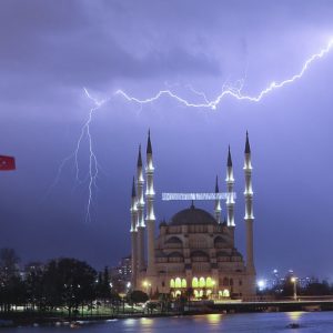 ADANA, TURKEY - JANUARY 30: Lightnings illuminate the sky over Sabanci Mosque in Adana,Turkey on January 30, 2019. ( Burak Milli - Anadolu Agency )