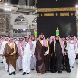 وطاف الأمير الشاب حول الكعبة، وتعلق بأستارها، كما قام بجولة داخلها وصعد على سطحها.