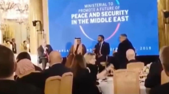 وتم التقاط الفيديو -كما يبدو- بهاتف محمول، خلال جلسة لم تحظ بتغطية صحفية على هامش مؤتمر وارسو للسلام والاستقرار في الشرق الأوسط.