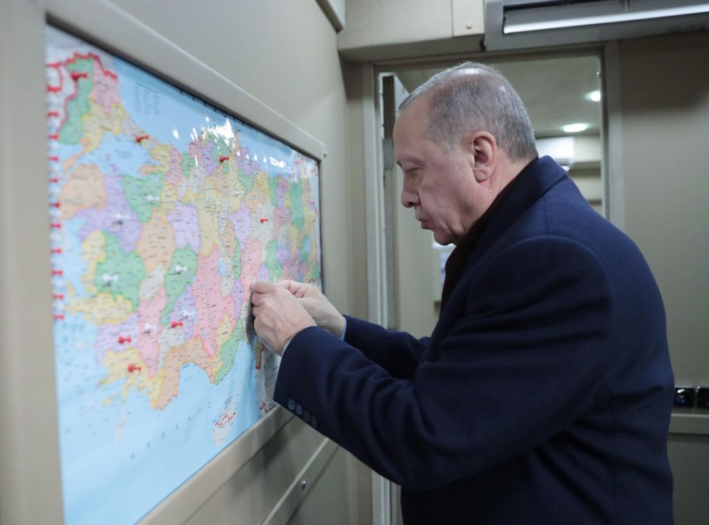 وتظهر صور متعددة أردوغان وهو يضع إشارة على الولايات التي يزورها ضمن استراتيجيته للتواصل مع الشعب التركي في جميع الولايات، في إطار حملته استعداداً للانتخابات المحلية المزمع إجراؤها في 31 مارس/آذار الماضي.