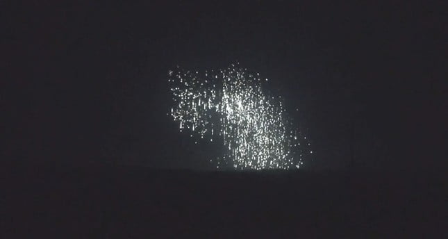 وبحسب مشاهد مصورة، يظهر بوضوح سقوط قنابل الفوسفور الأبيض على البلدة رغم حظر استخدامها دوليًا.