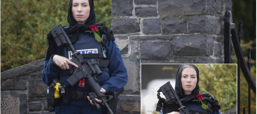 ما قصة الشرطية المحجبة التي حملت سلاحاً ووردة حمراء في مقبرة نيوزيلندا؟