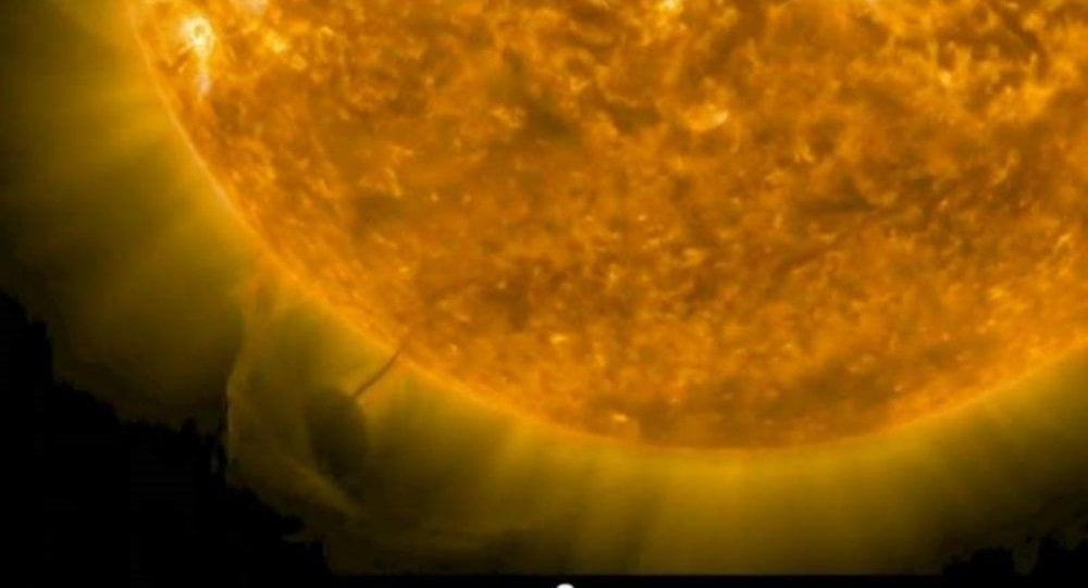 ويظهر في الفيديو كيف تختفي الشمس وراء الأرض، ثم تخرج من الظل، ويرافق ظهورها ظهور وميض مشرق.
