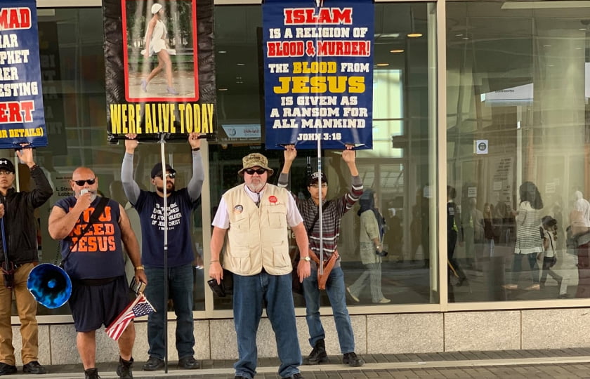 صورة أمام لافتات مظاهرة مناهضة للإسلام