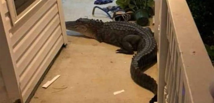 وأدّت حركات التمساح إلى خدوش وضرر على الباب والممر الأمامين لمنزلها، لكنه لم يكسر نافذة الباب.